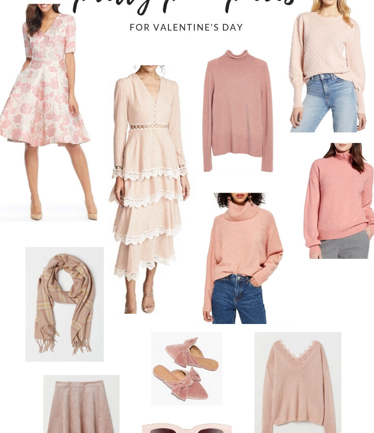 floral dress. pink dress. pink roll turtleneck sweater. pink dot sweater. pink frill sweater. pink chunky turtleneck sweater. pink lace v-neck sweater. pink tie mules. pink sunglasses. pink faux suede skirt. pink scarf. Valentine’s Day is coming up quick and…