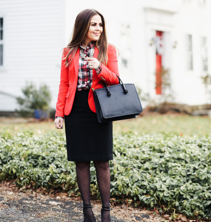 plaid ruffle shirt. pencil skirt. similar blazer. satchel. similar necklace. tights. similar shoes. Last year, Christmas morning fell on a Sunday. We were in Idaho with my in-laws and there was a huge blizzard, so instead of heading off to…