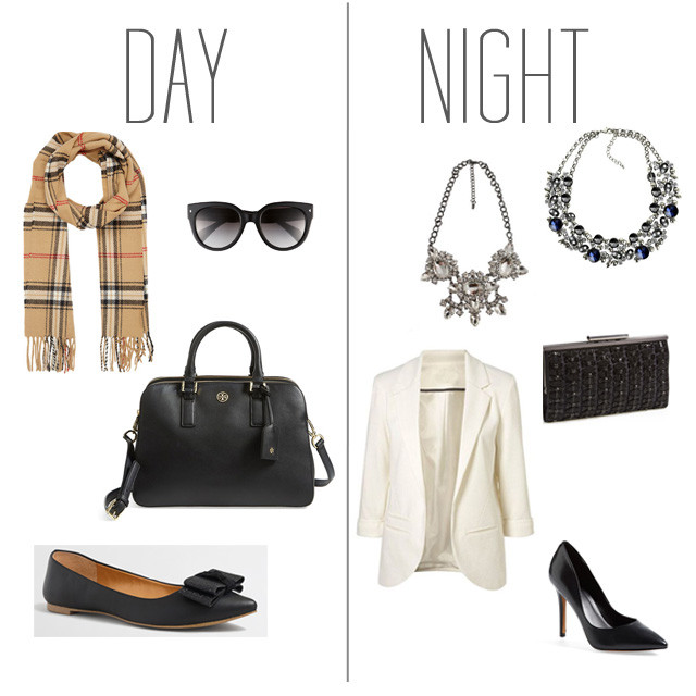 Day: Scarf. Bag. Shoes. Sunglasses. Night: Blazer, Necklace, Necklace, Pumps, Clutch.