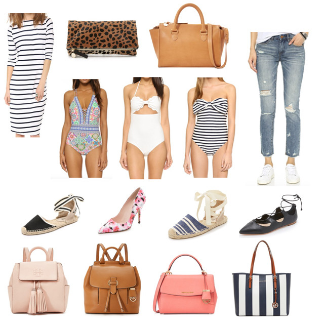 dress. leopard clutch. cognac bag. denim. tile swimsuit. white swimsuit. striped swimsuit. espadrilles.  pumps. striped espadrilles. lace up flats. pink backpack. cognac backpack. coral bag. striped bag.